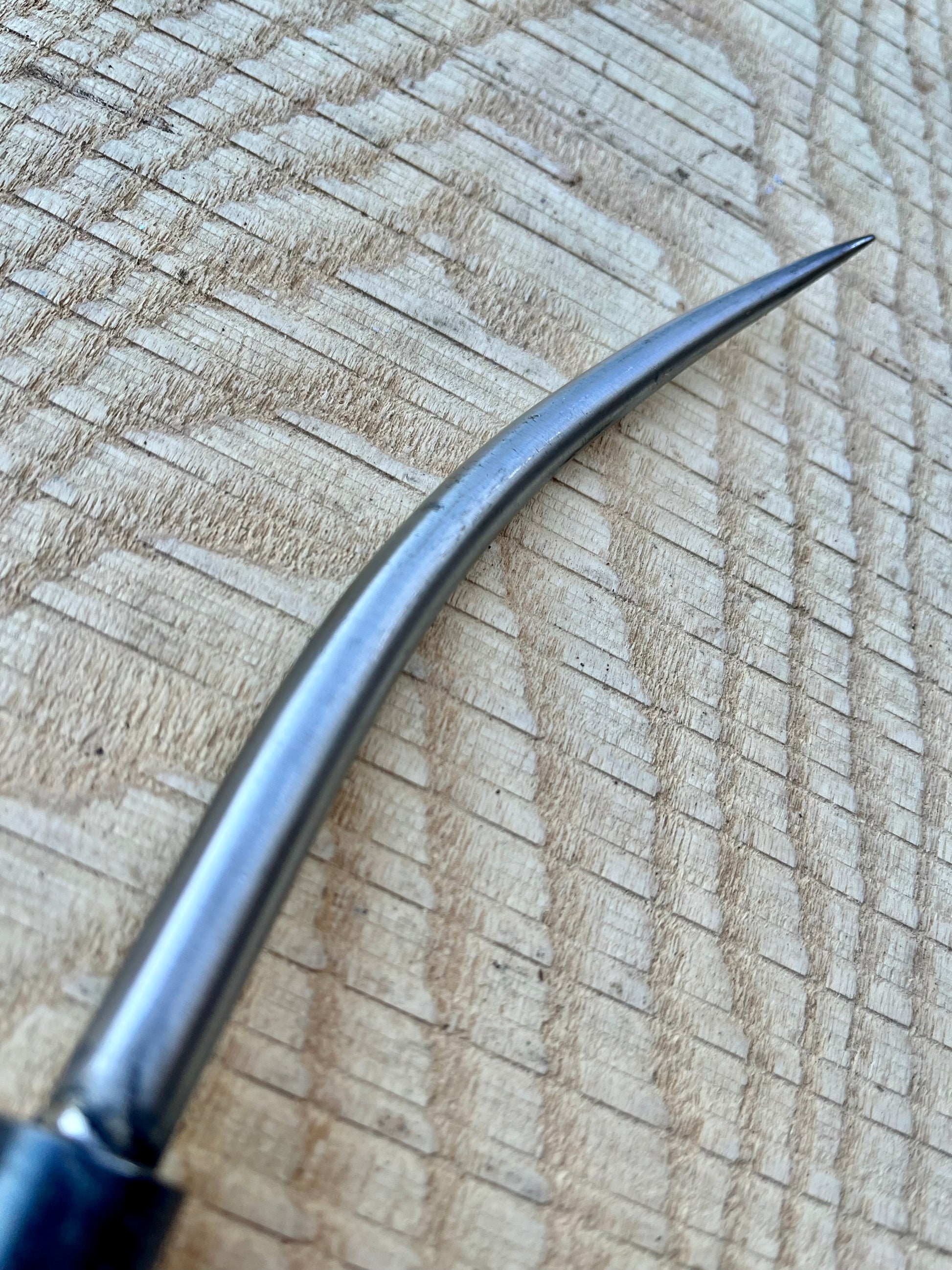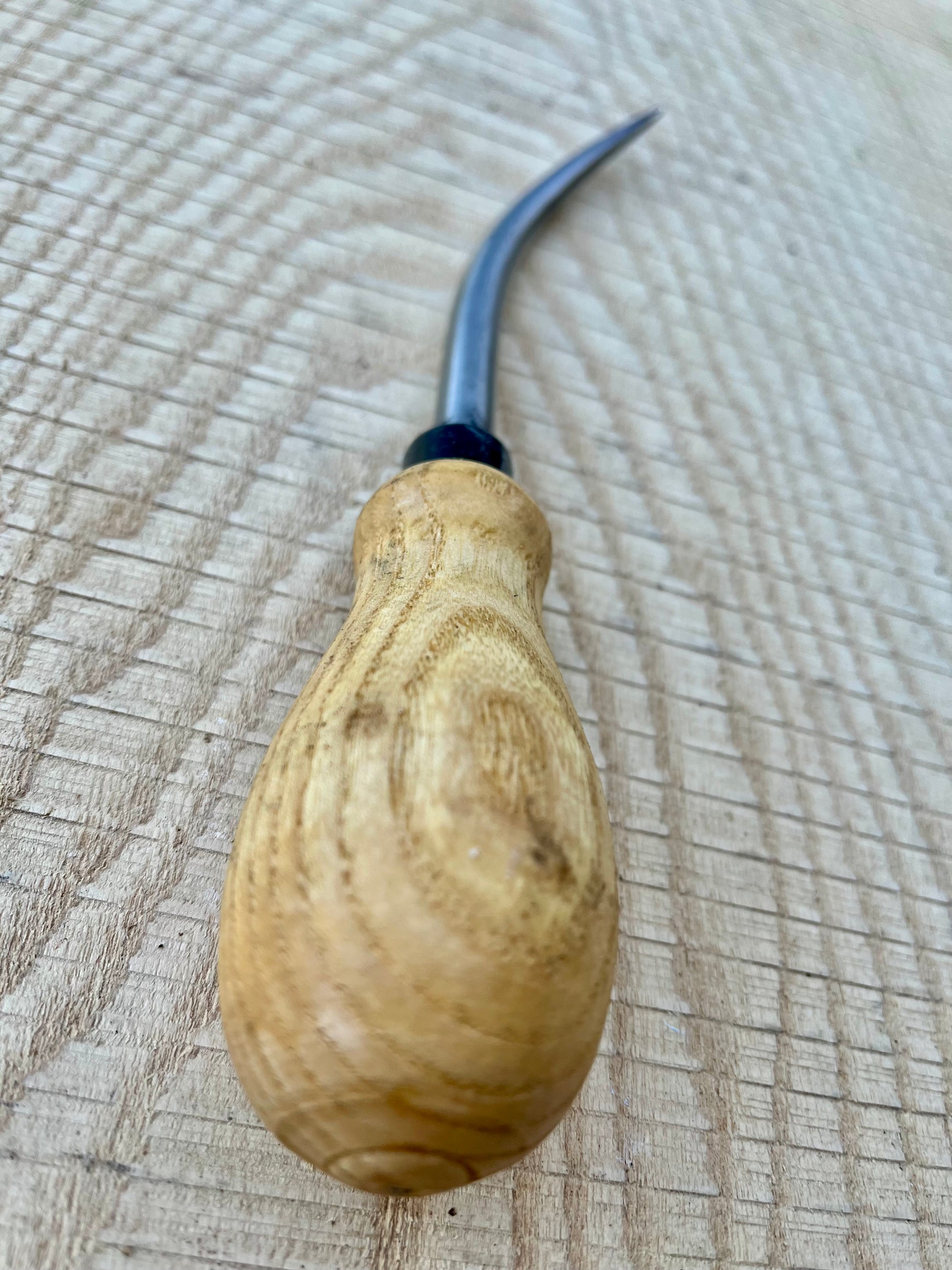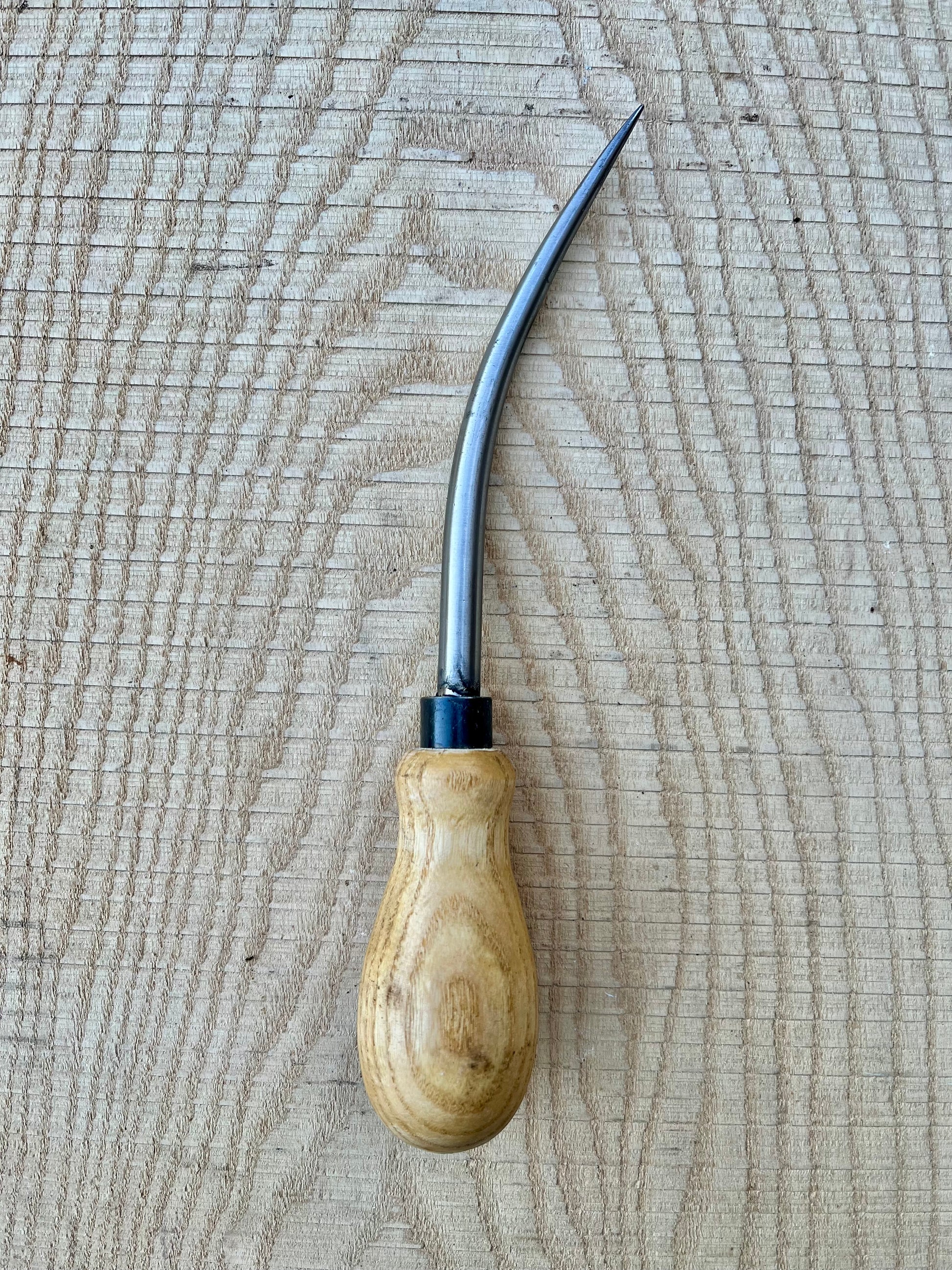 Hand made to our exacting standards, these bent bodkins have a tapered shank with hardened steel point and a turned, round ash handle.