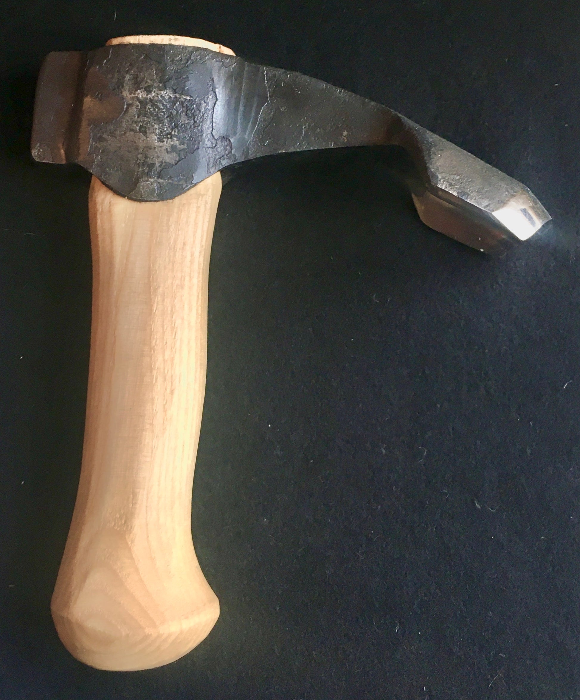 This adze is hand forged from a single piece of carbon steel. The head weight is 600g and has a smooth curved cutting face, 50mm corner to corner.