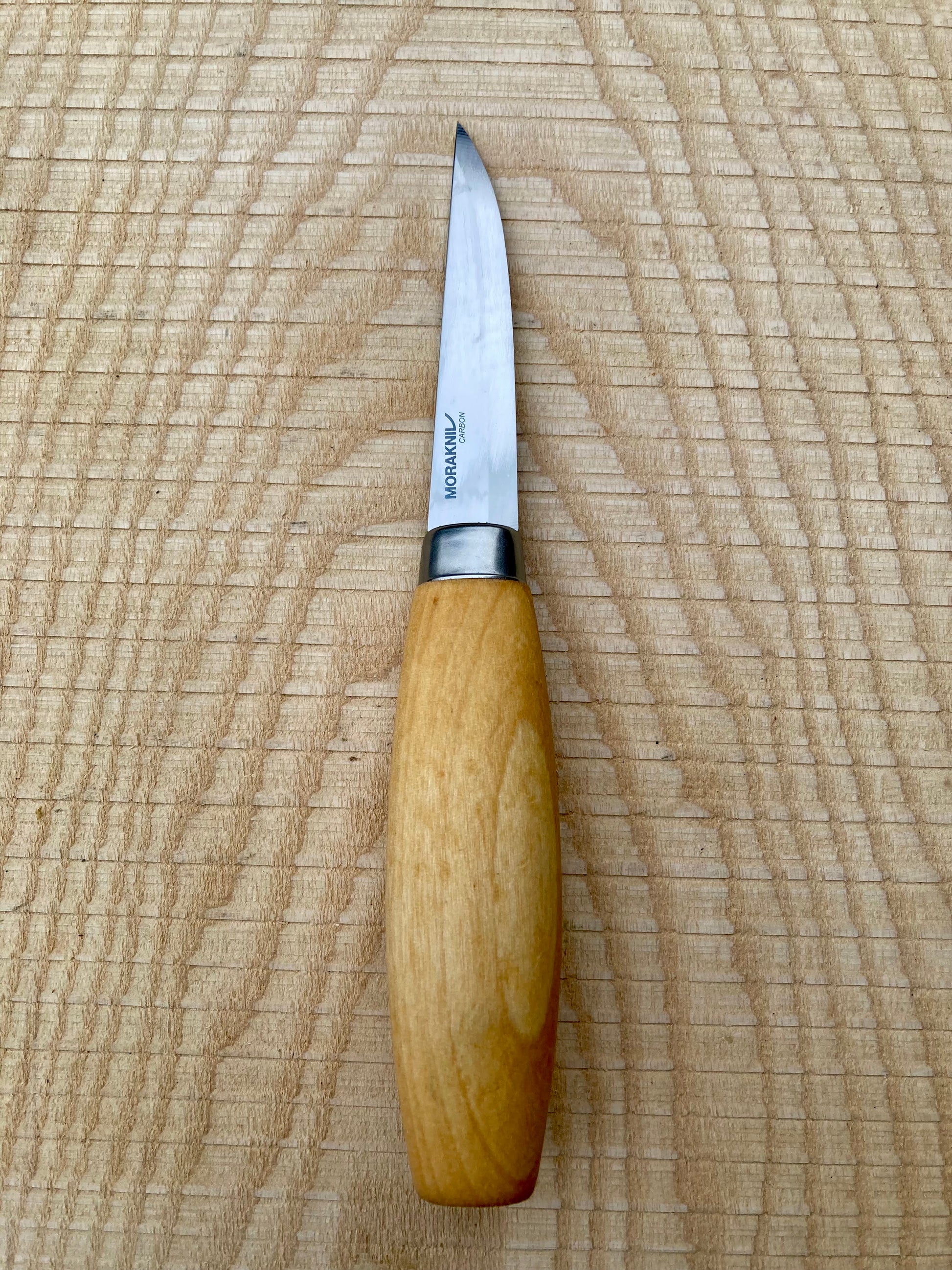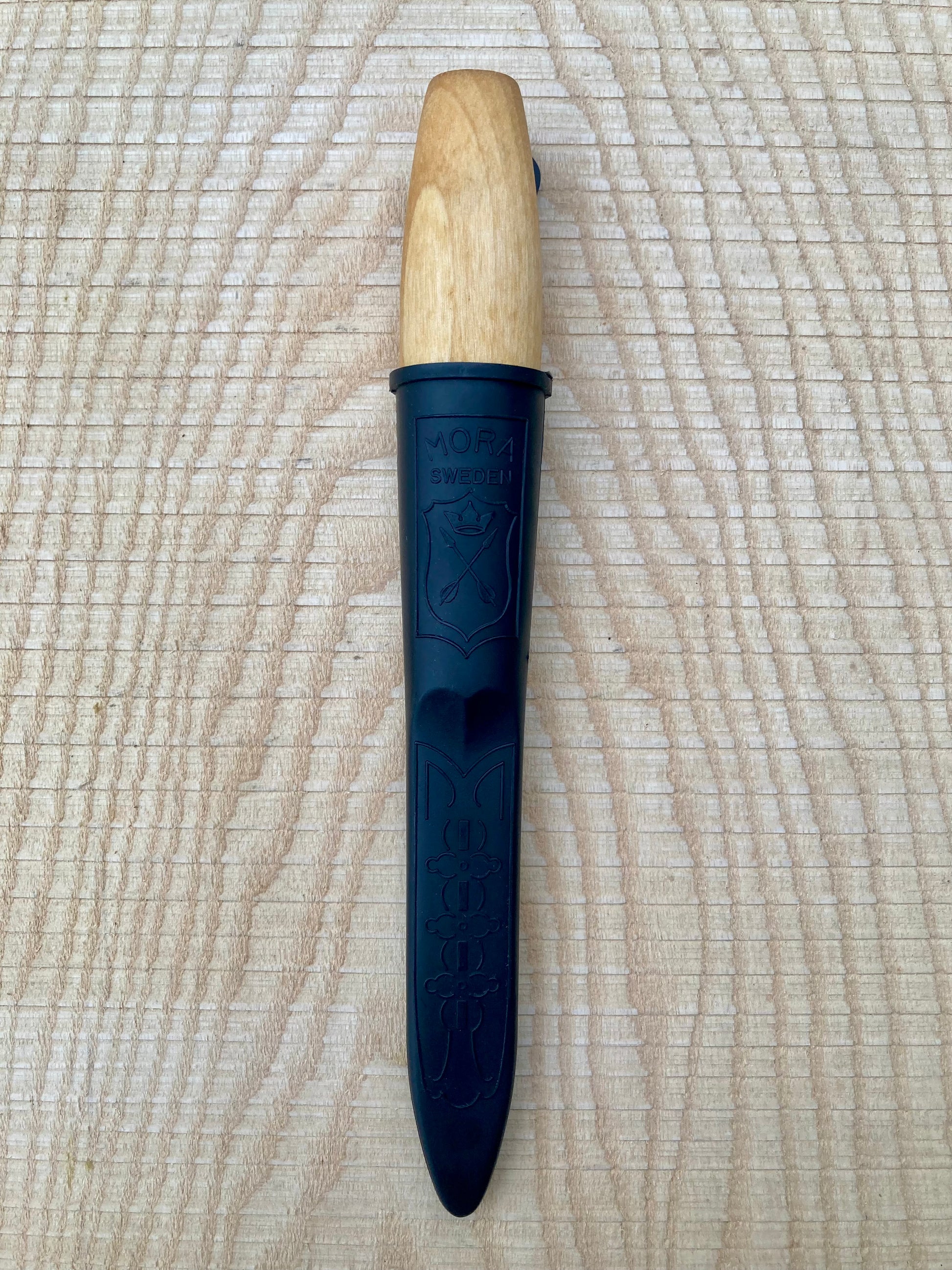 79mm Carbon Steel blade with a tapering handle and plastic sheath.